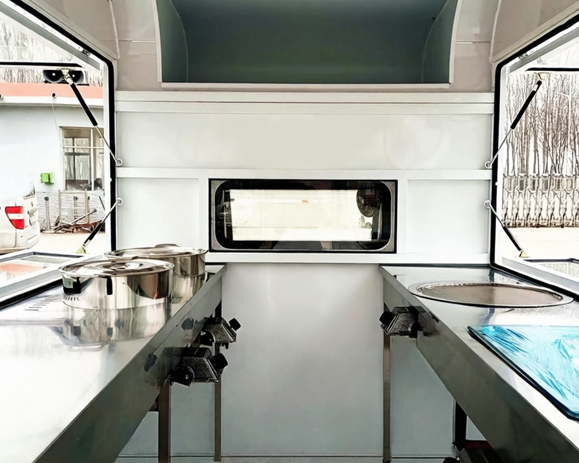 The interior is equipped with two soup buckets, as well as kitchen utensils such as frying tools and iron plates