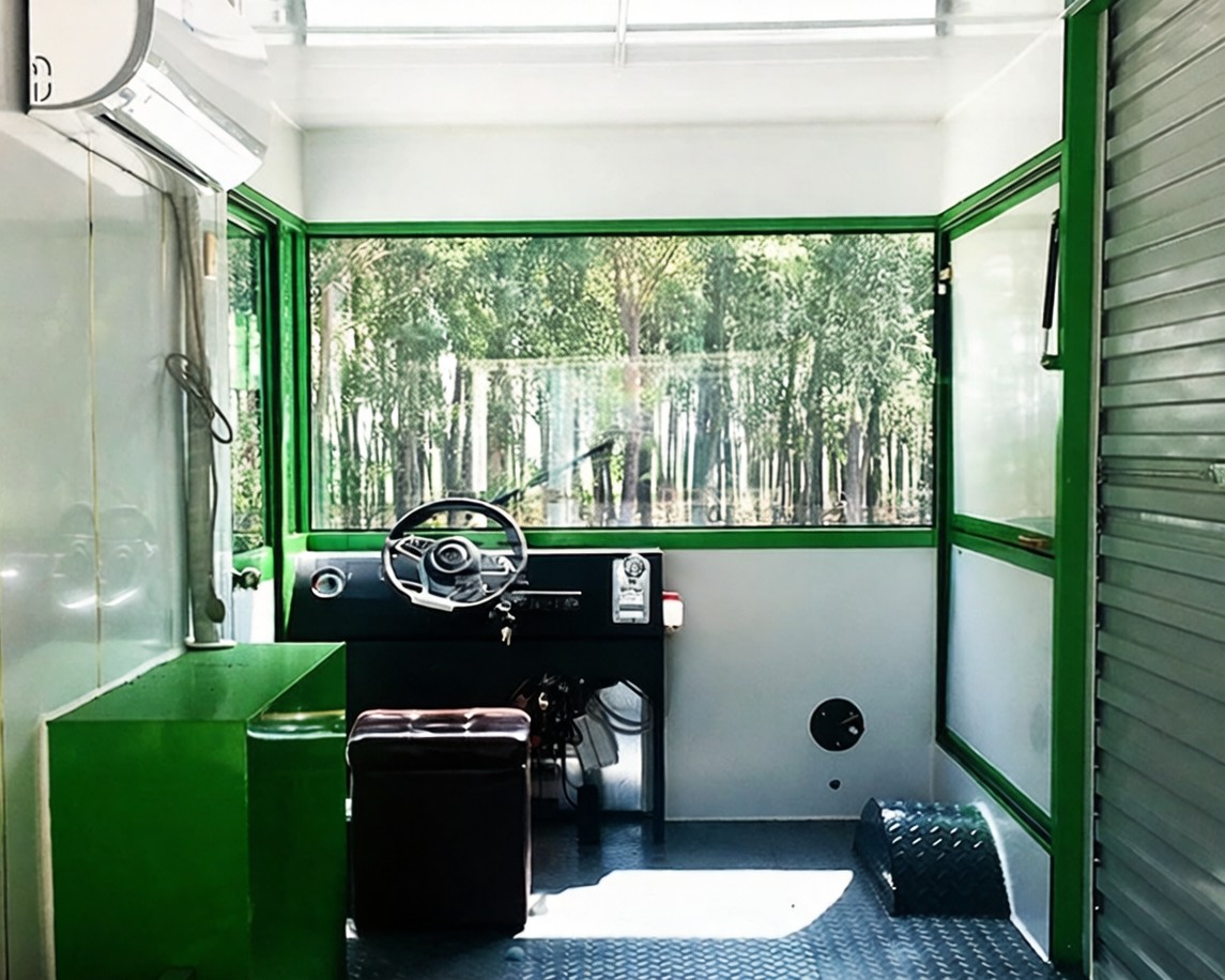 A roller shutter door on one side, with windows that can be opened from both sides, either by flipping up or flipping down
