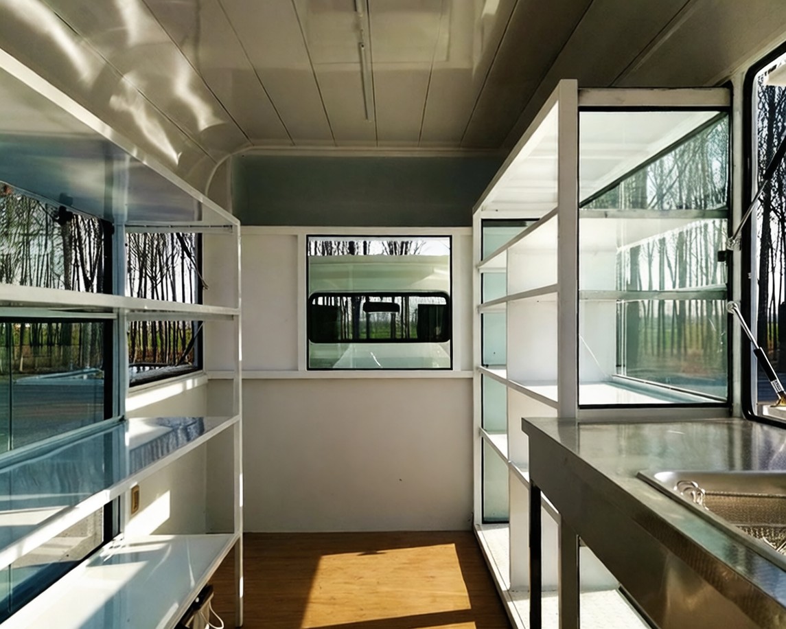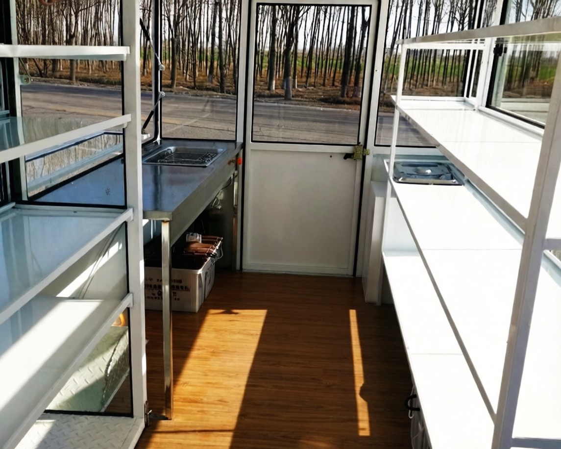Both sides of the interior are equipped with five-tier shelves for displaying goods